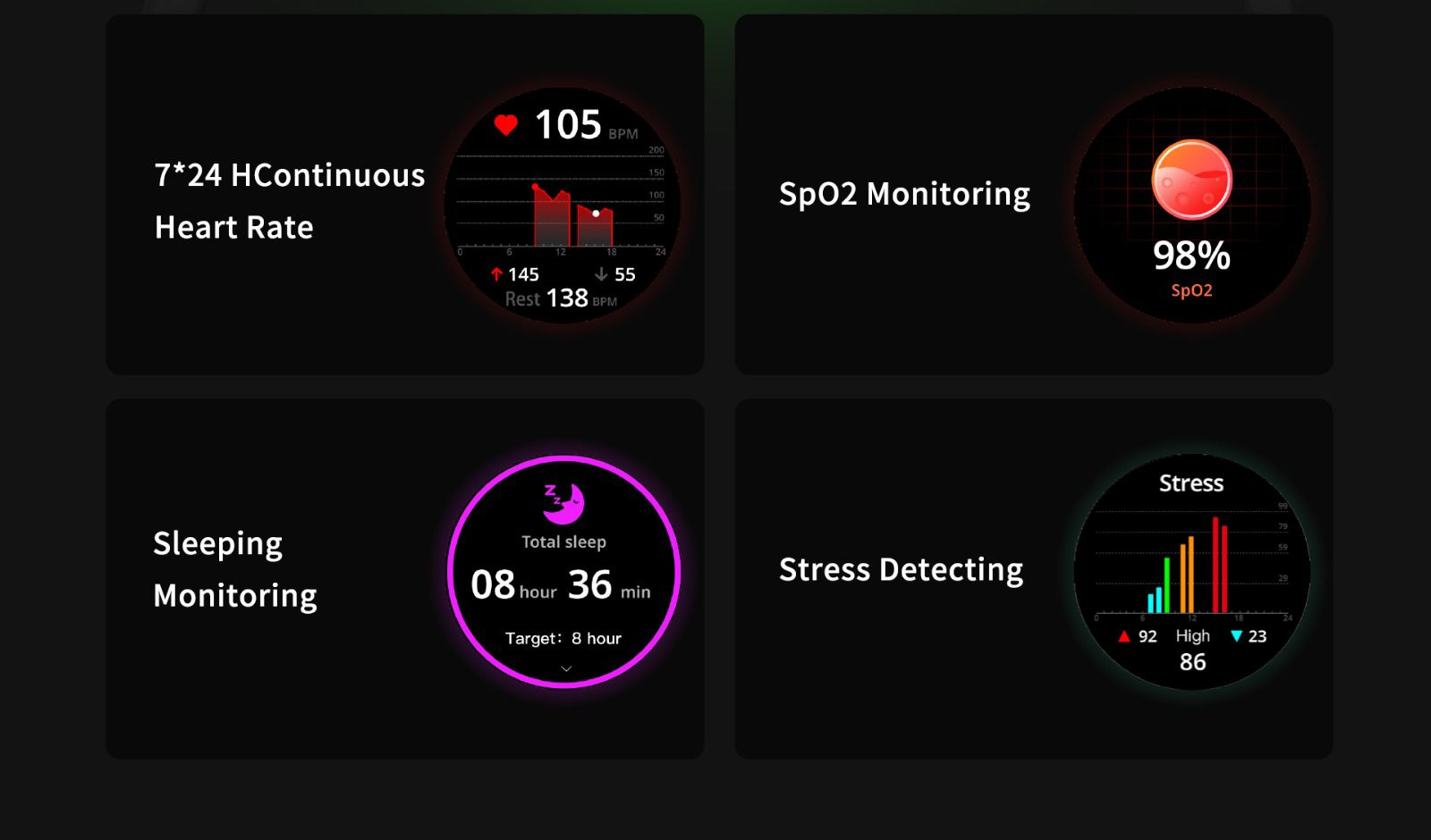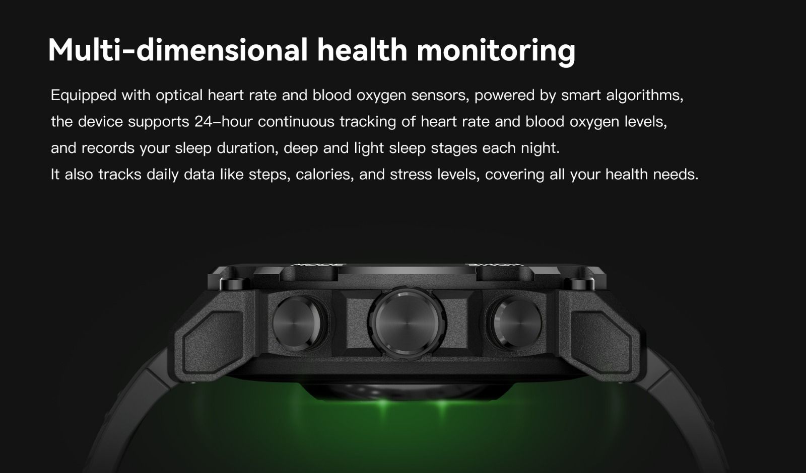 🫀 24/7 Health Monitoring – Heart rate, SpO₂, stress, and sleep tracking.