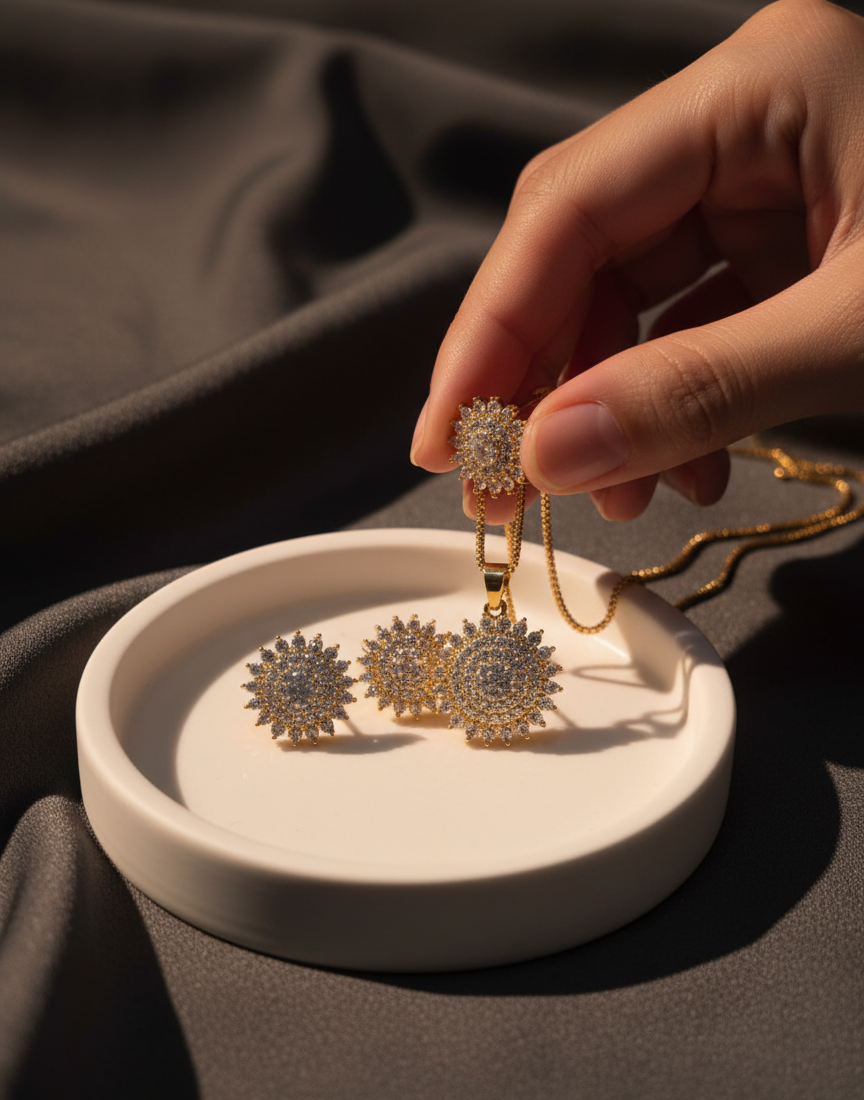 Illuminate your style with our mesmerizing 'Dazzling Sunburst' jewellery set. This stunning necklace features a brilliant circular pendant, intricately adorned with countless sparkling white cubic zirconia crystals arranged in a captivating sunburst design. Perfectly complemented by matching stud earrings, this set promises to add a touch of radiant glamour to any look.