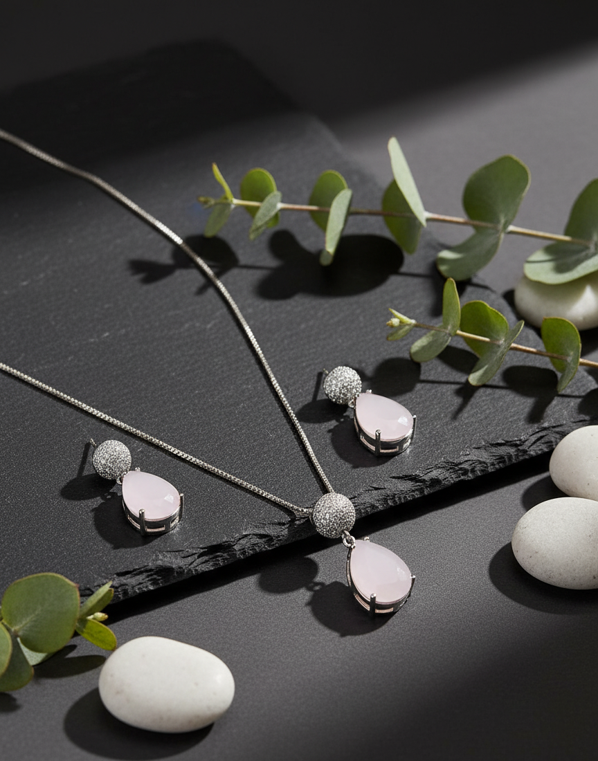 Embrace subtle elegance with this Pink Teardrop Pave Silver Jewelry Set.